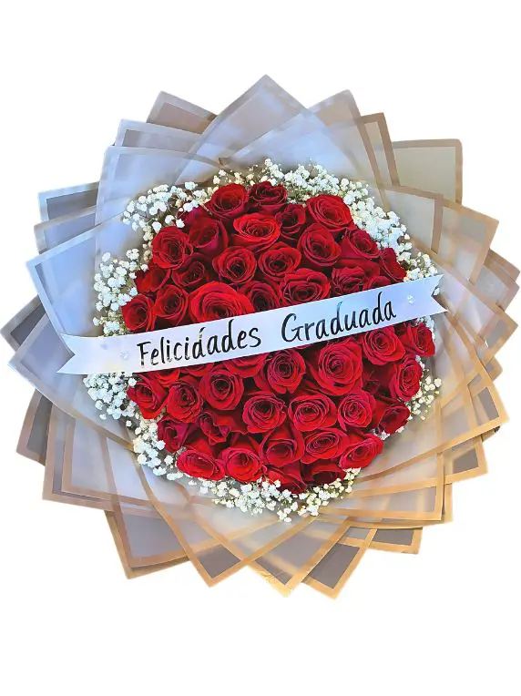This sophisticated design features 50 Premium Pink Roses, crafted to deliver a memorable impact. Perfect for commemorating special moments, the arrangement is wrapped in waterproof paper of your choice and adorned with golden butterflies for a touch of sparkle. Includes a silk bow with your preferred message and custom toppers.